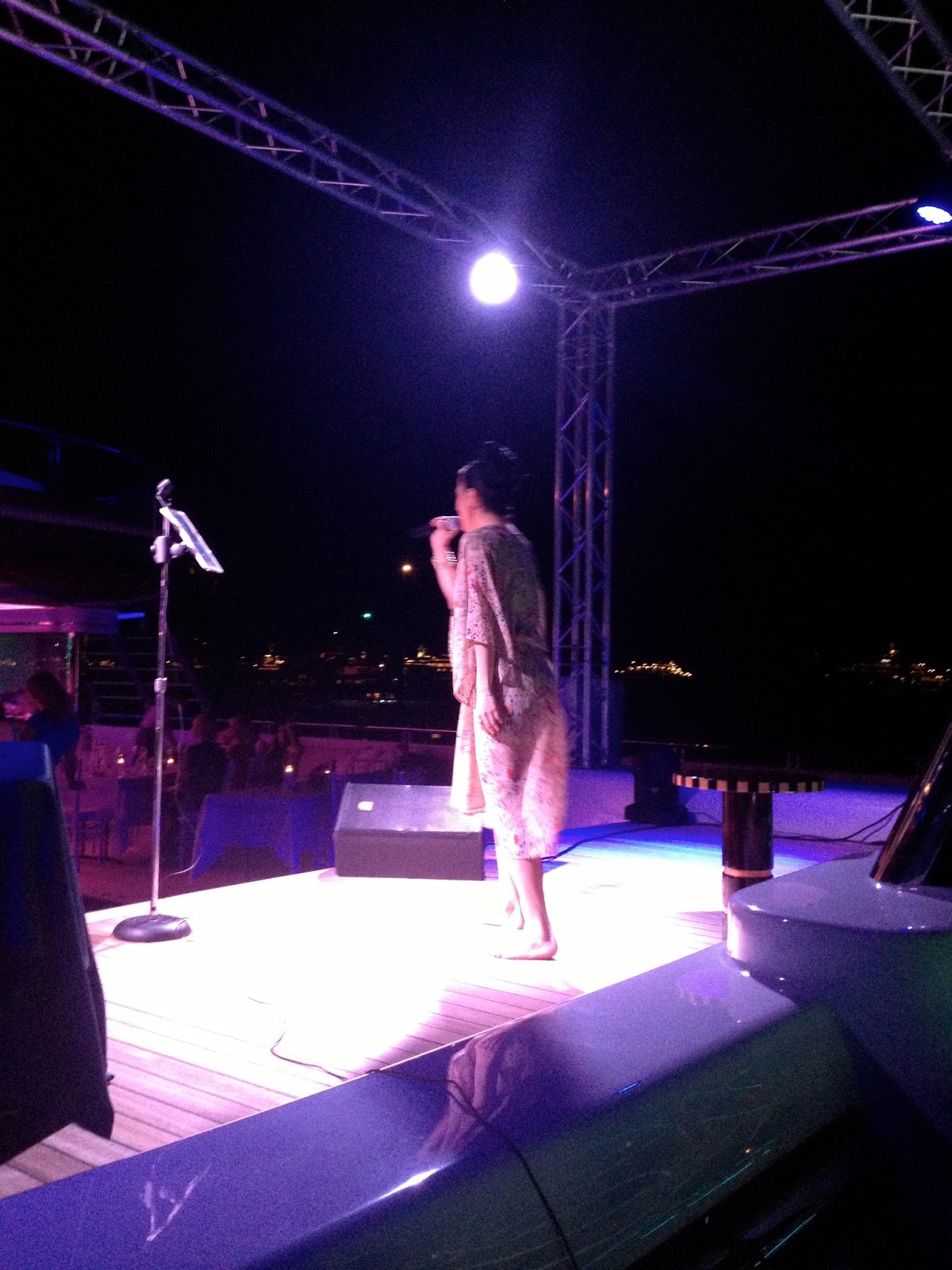 Mia and Jus Ske were both from New York. They were both New York cool. They both thought tenders arriving with red and green lights were Police boats. Bless New Yorkers. I did illegally take a couple of photos of them both performing. No police boats arrived.