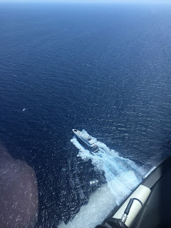 Instead of being whisked into a car I was escorted to the helipad. My boat you see had already started heading to Palma. Not to worry I would catch it up with the Helipilot. I have not spent much time in Helicopters but I did my best not to drool. The pilot gleefully informed me we only had a quarter of a tank of fuel and would have to be pretty smart to catch them up.